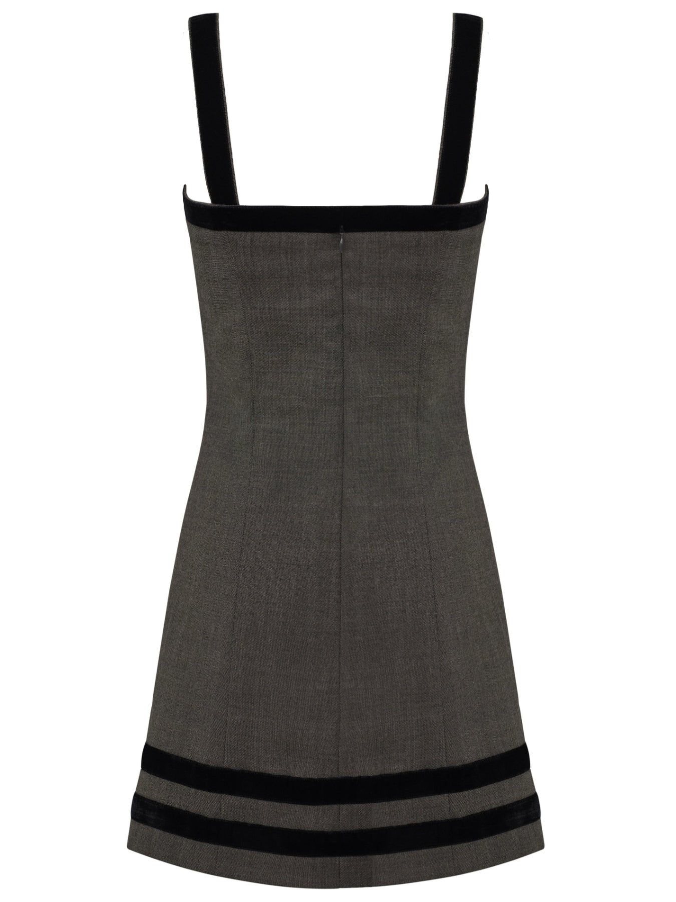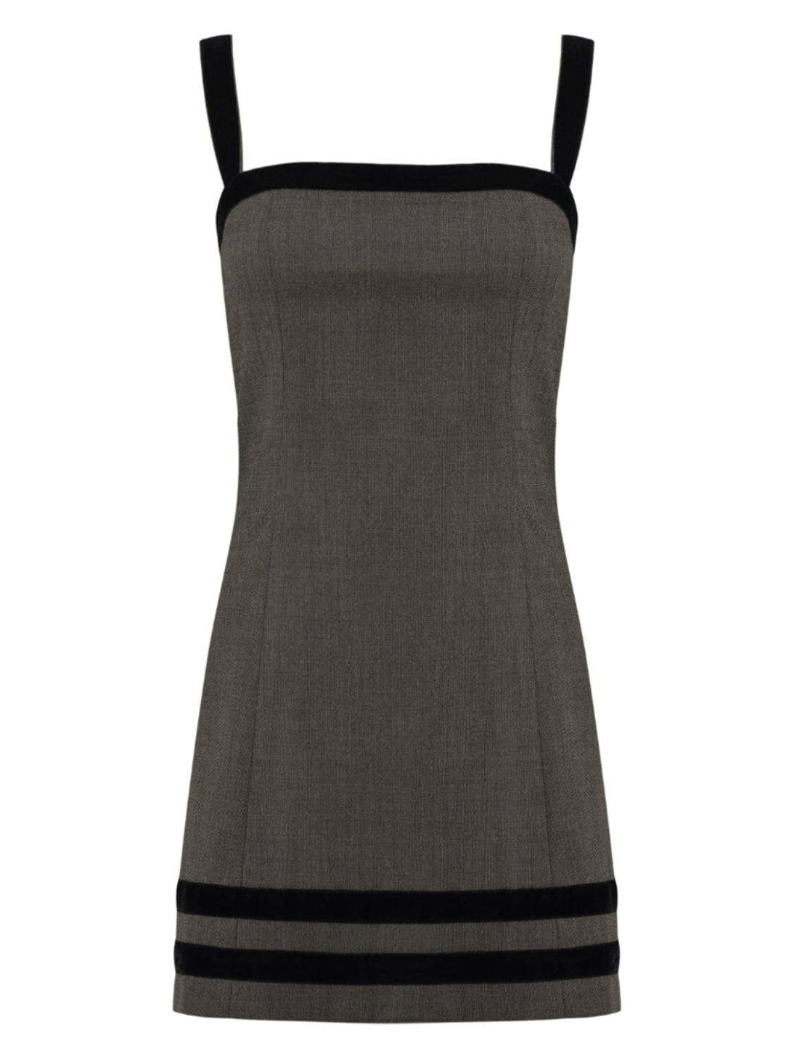 Tailored hourglass silhouette with velvet trim, doubled at the hem for subtle occasion.