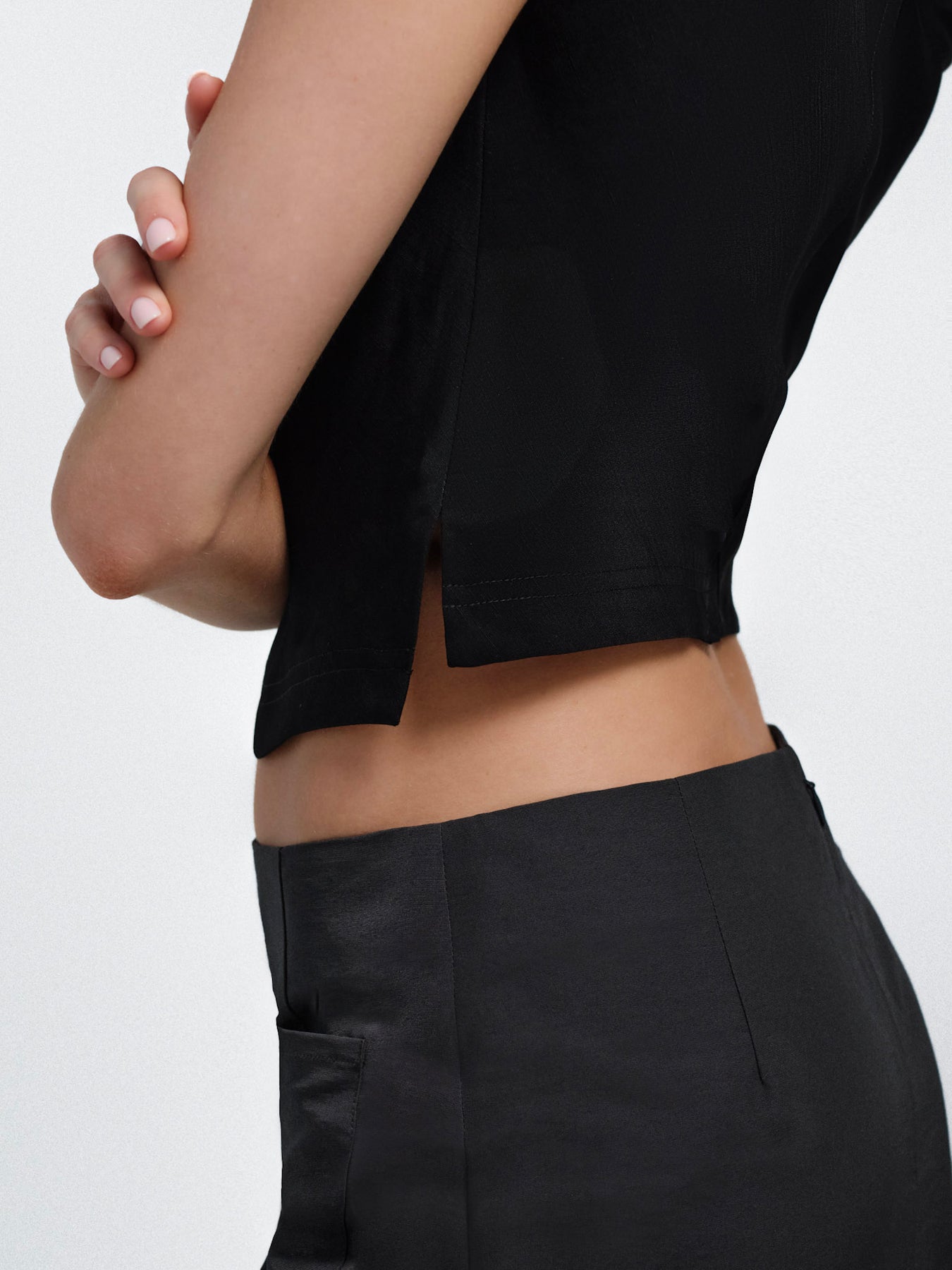 Hits at the natural waist with side slits for comfort.