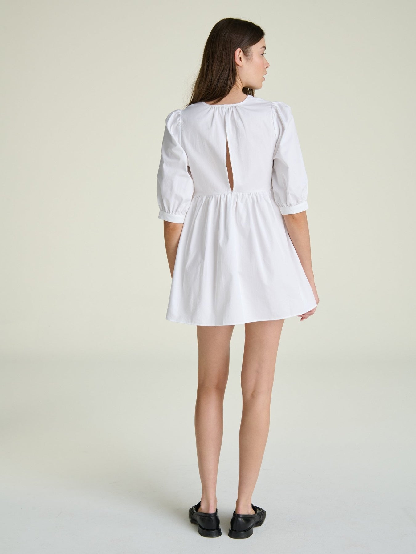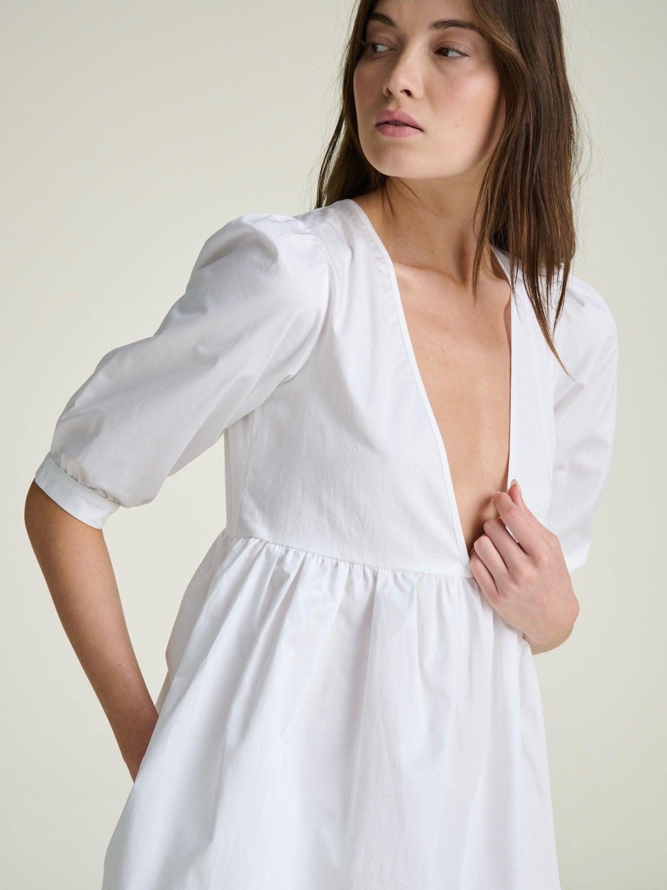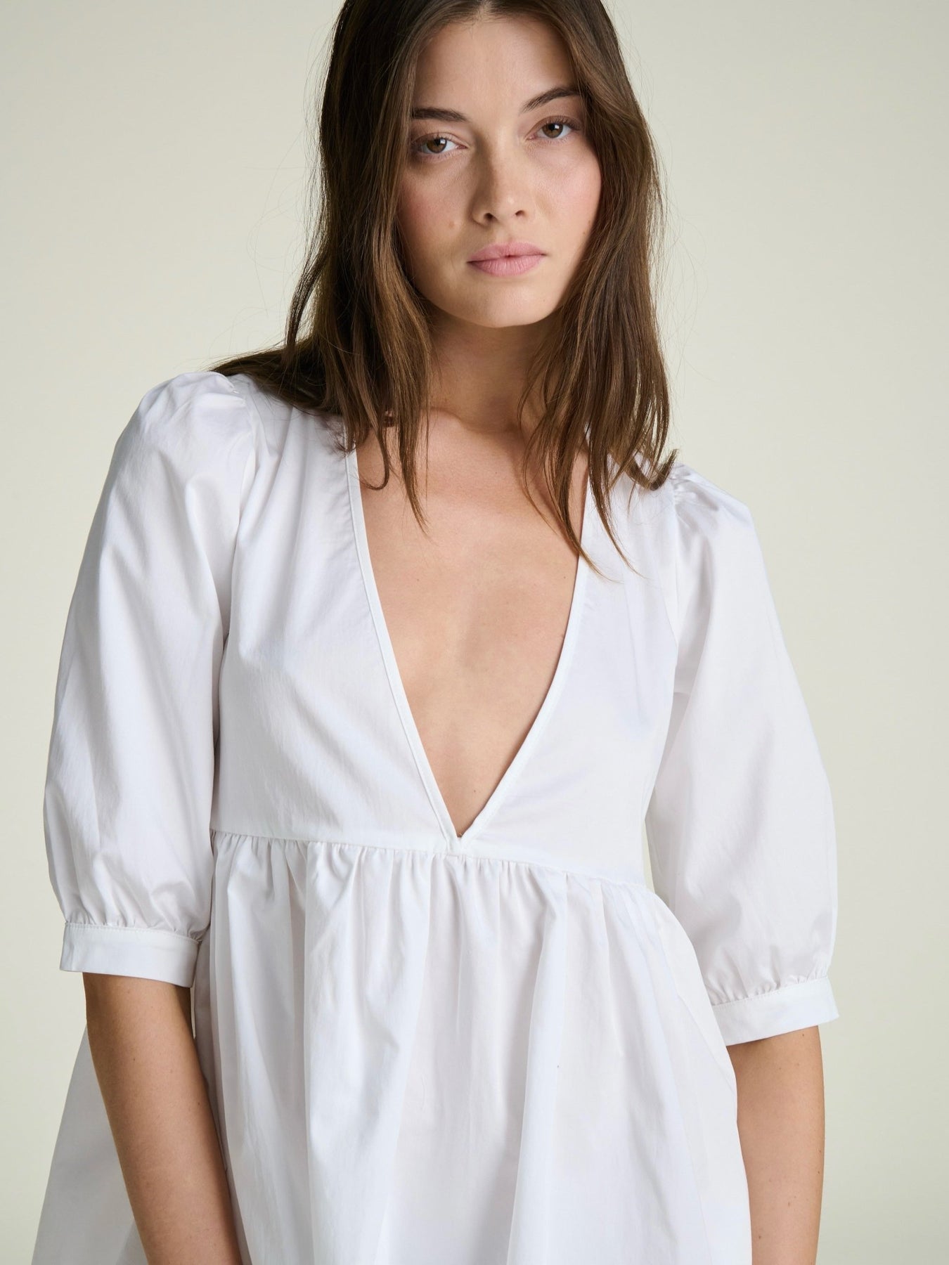 woman wearing a mini white cotton shirt dress with a deep v and puff sleeves and a babydoll ruched waistline on a grey background