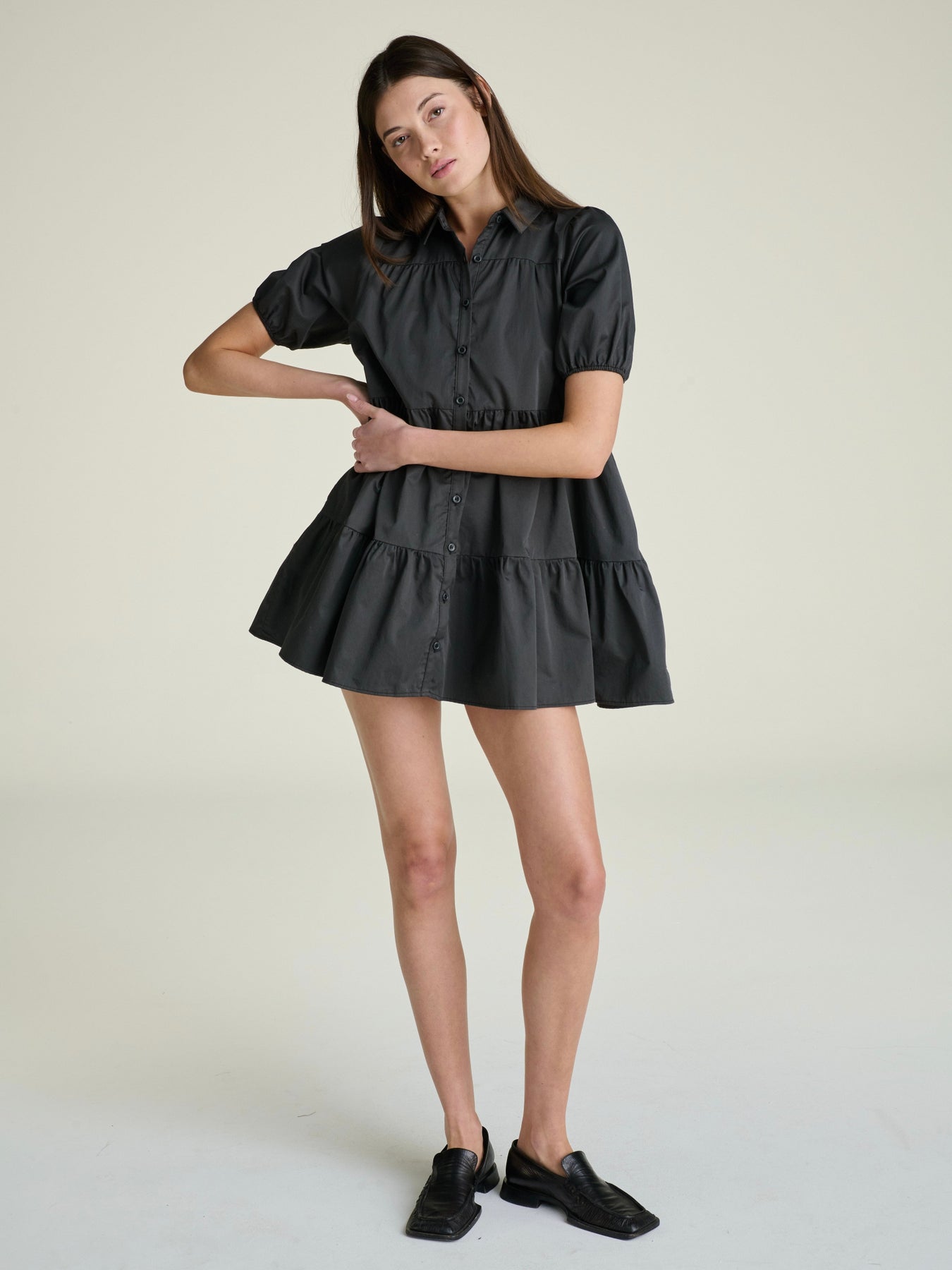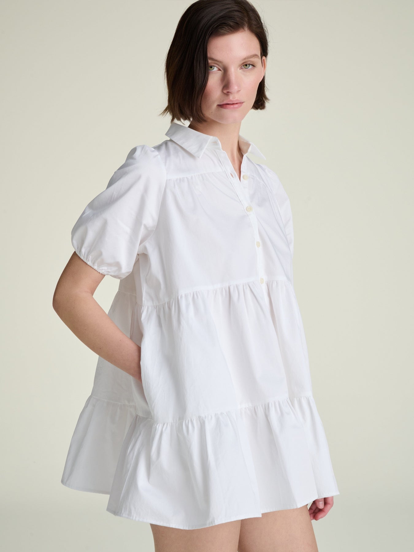 Collared A-line dress with a full button-down front placket and tiered shirring for a flattering, airy silhouette.